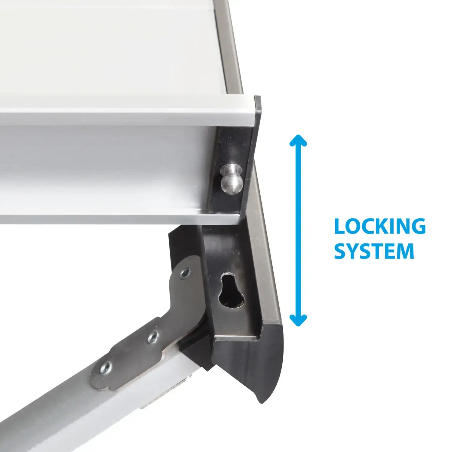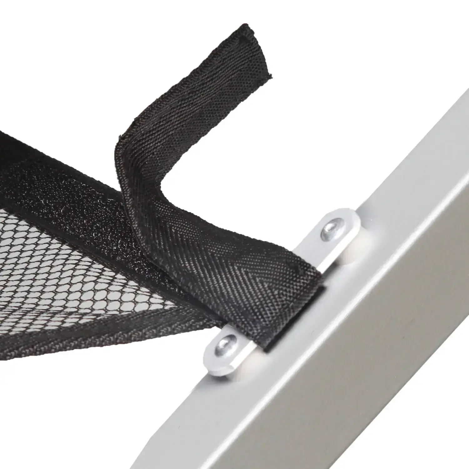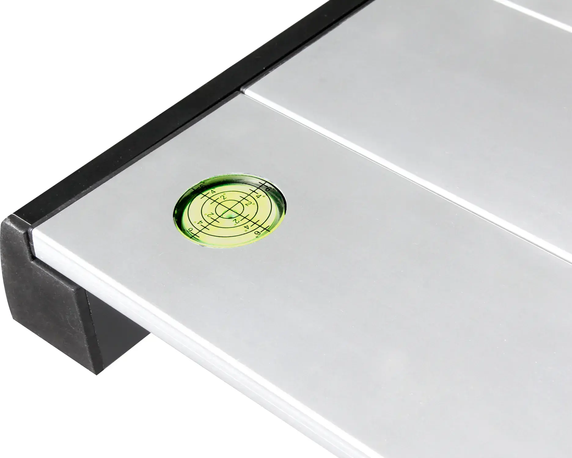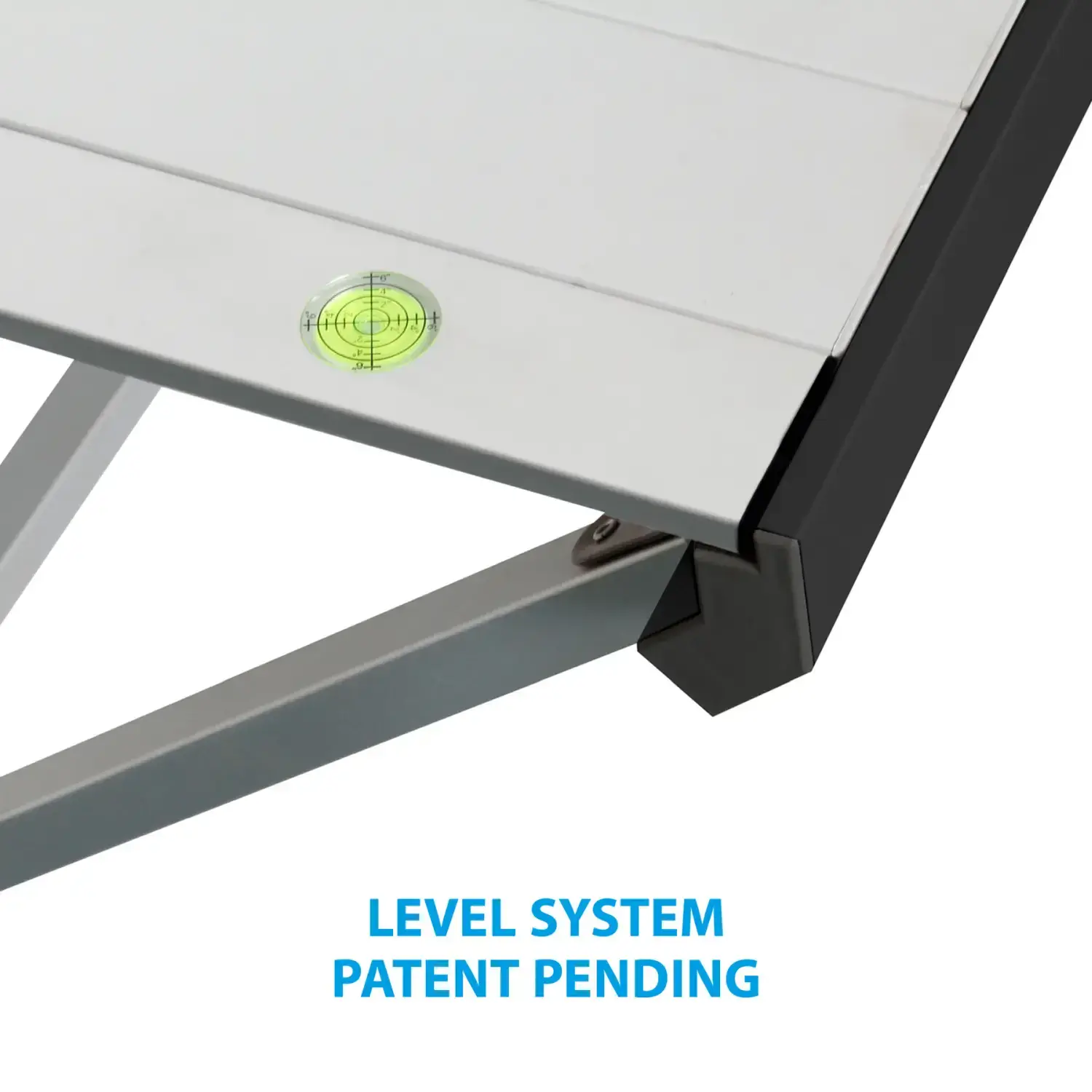 The Axia has an integrated spirit level on the end slat which lines up with the adjustable corner foot to get the perfect level. The central stabilising bar gives this table added stability with a mesh shelf underneath for keeping the table clear at meal times.