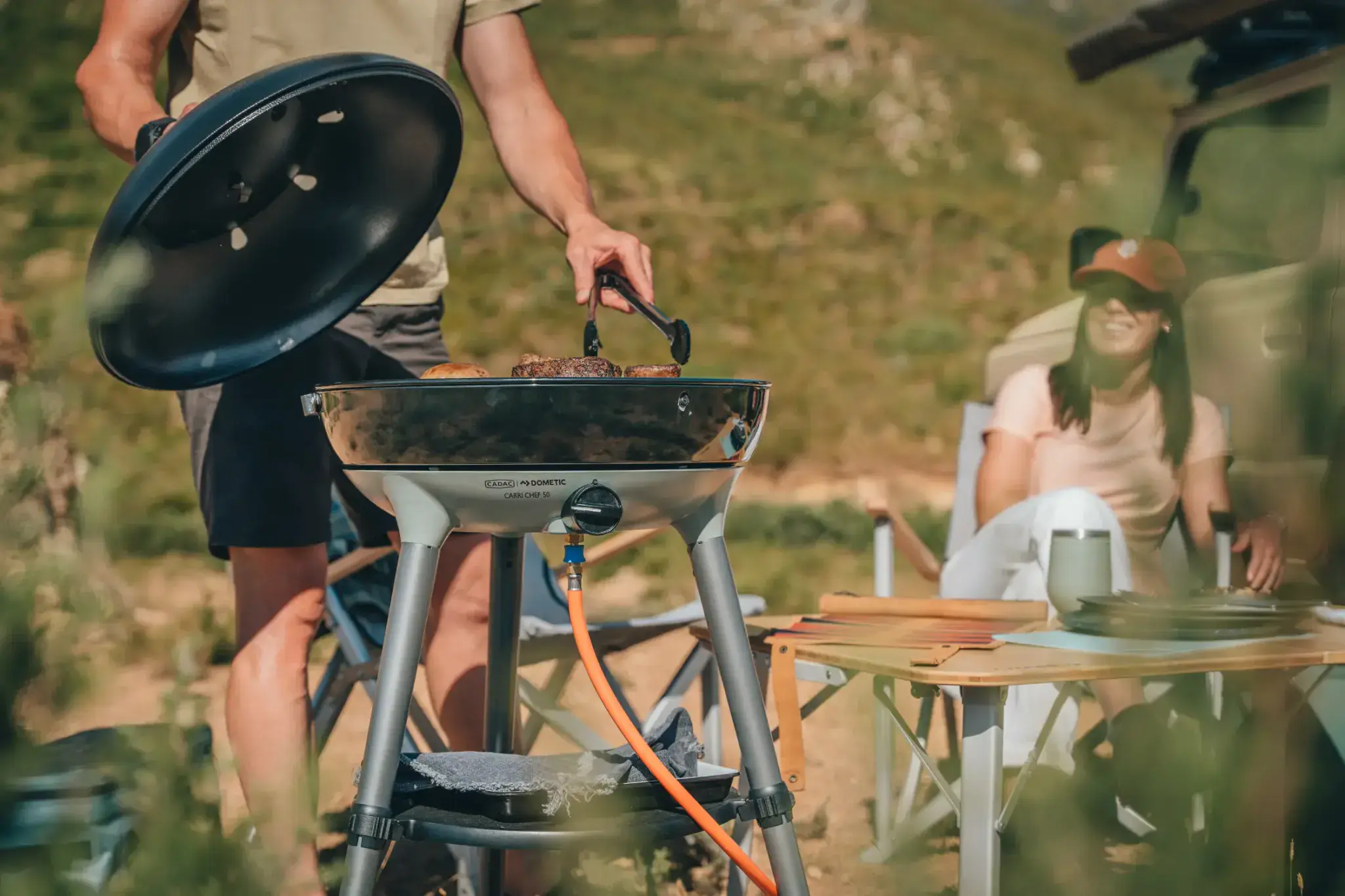 The Carri Chef 50 BBQ has a dome lid with integrated thermometer and stay-cool handle that hooks onto the side of the BBQ to act as a windshield. The 2-part legs simple slot together and there’s an adjustable foot on one for stability and levelling on uneven ground – ideal for barbecuing in any camping spot.