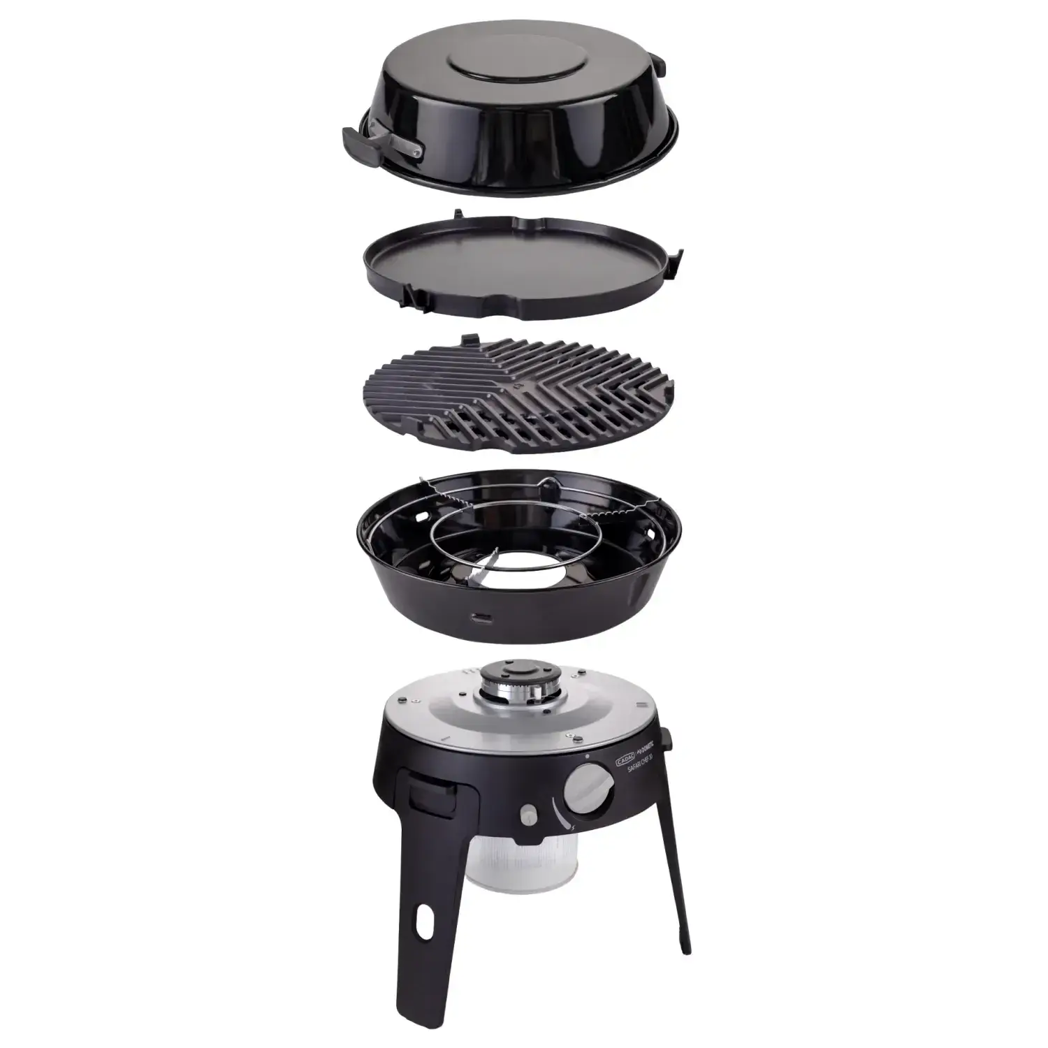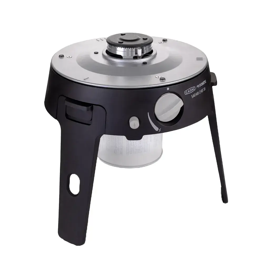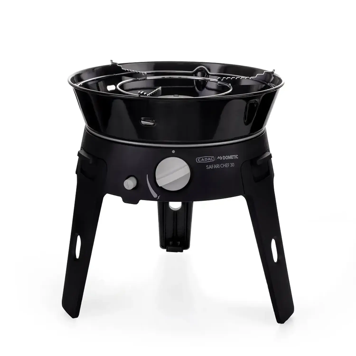 The Cadac Safari Chef 30 HP is a compact, all-in-one, gas BBQ, grill and cooker that runs of a single EN417 threaded gas cartridge (not included) which screws directly into the base.