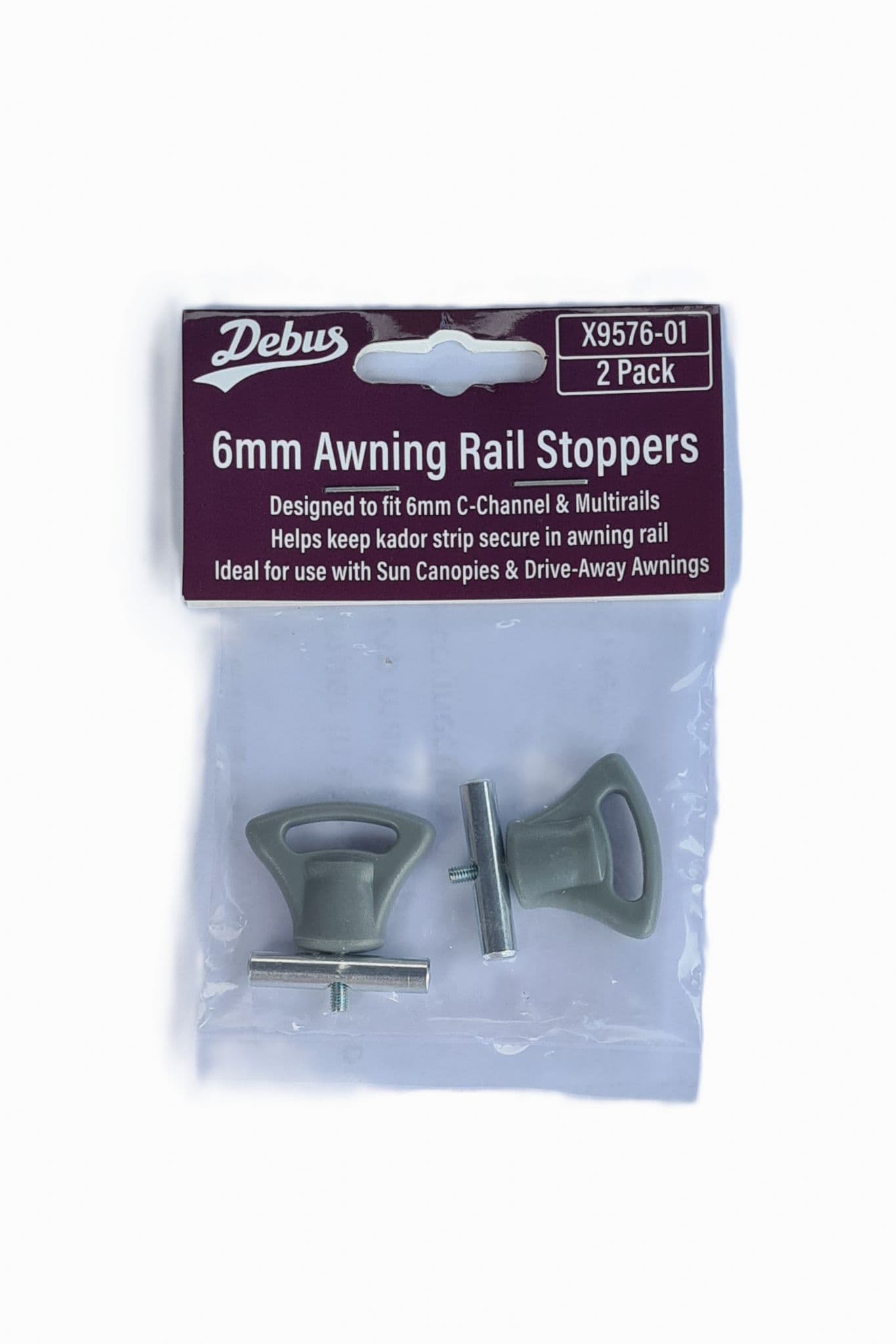 These Debus Awning Rail Stoppers will fit into a c-channel awning rail to prevent a Sun Canopy or Drive-away awning from moving side to side.