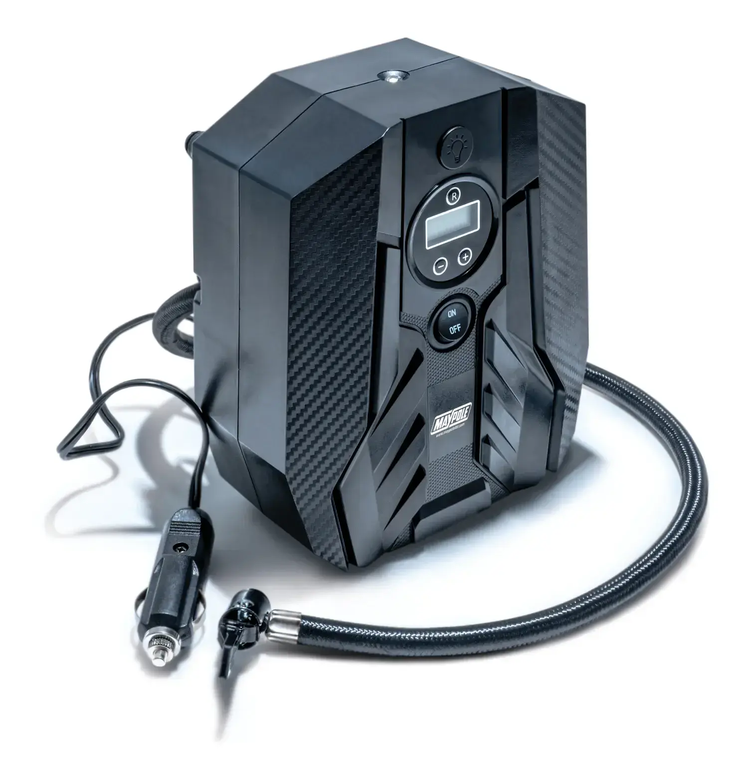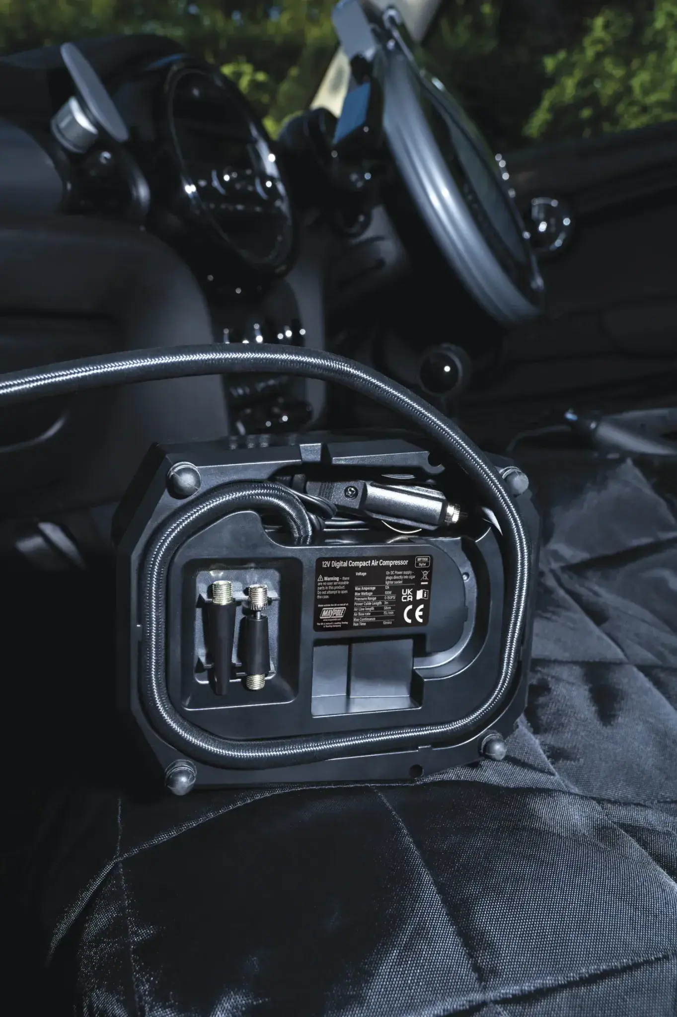 The Maypole Compact 12V Digital Tyre Inflator is a neat little compressor that plugs straight into a 12v vehicle socket to top-up your tyre pressure when on the road. This 12V electric tyre pump comes with adaptors for inflating bike tyres – ideal for keeping campervan and bike tyres safely inflated on road trips.