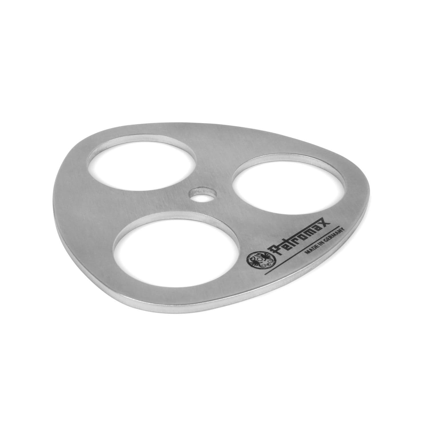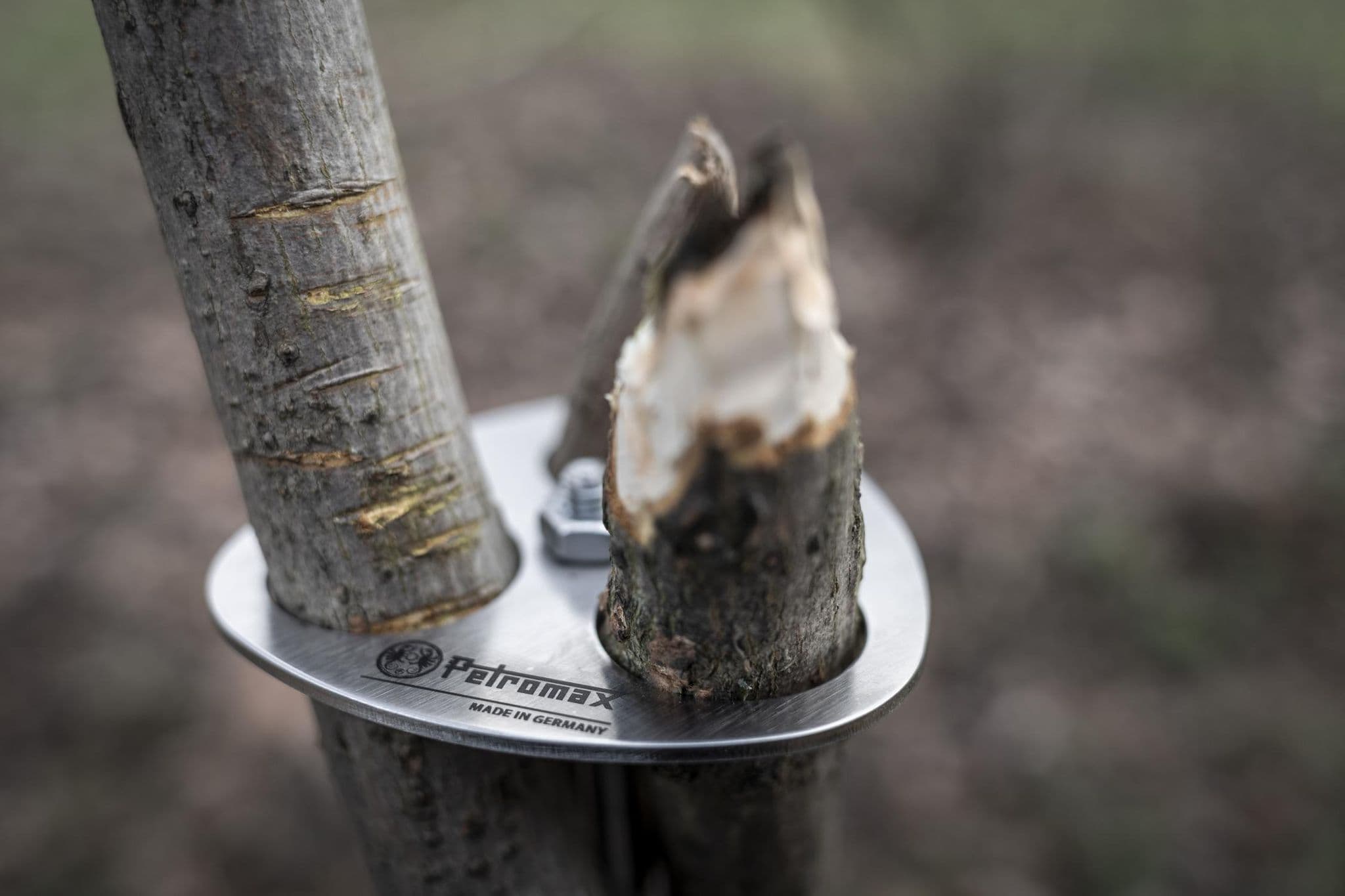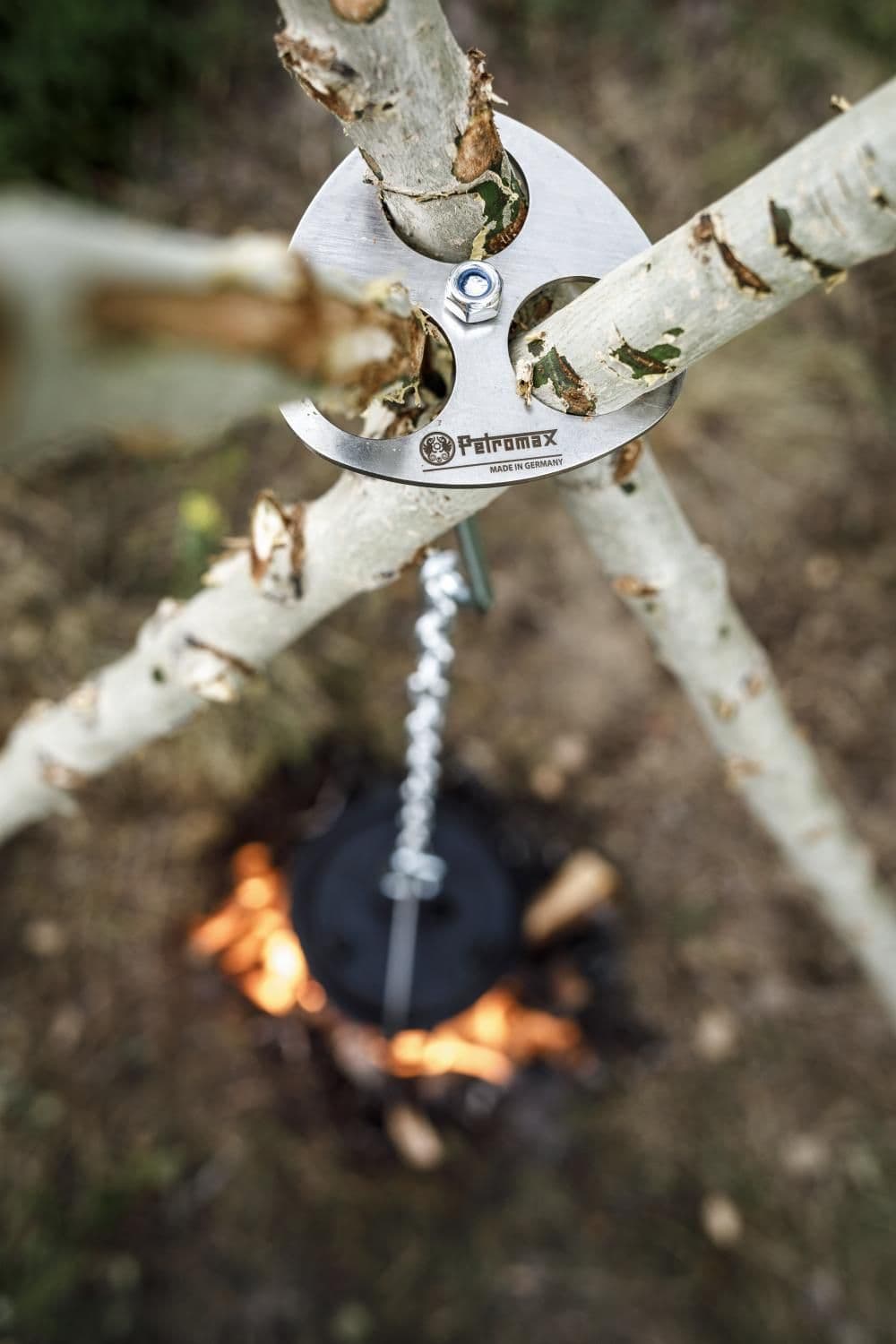 The Petromax Cooking Tripod Lashing Set allows a self-made cooking tripod to be set-up over an open campfire to suspend a Dutch Oven or teakettle. This lightweight stainless-steel disc, chain and hook set fits in a backpack and just needs 3 straight tree branches to form a cooking tripod. Cooking temperature can be controlled by adjusting the length of the tripod chain over an open fire.