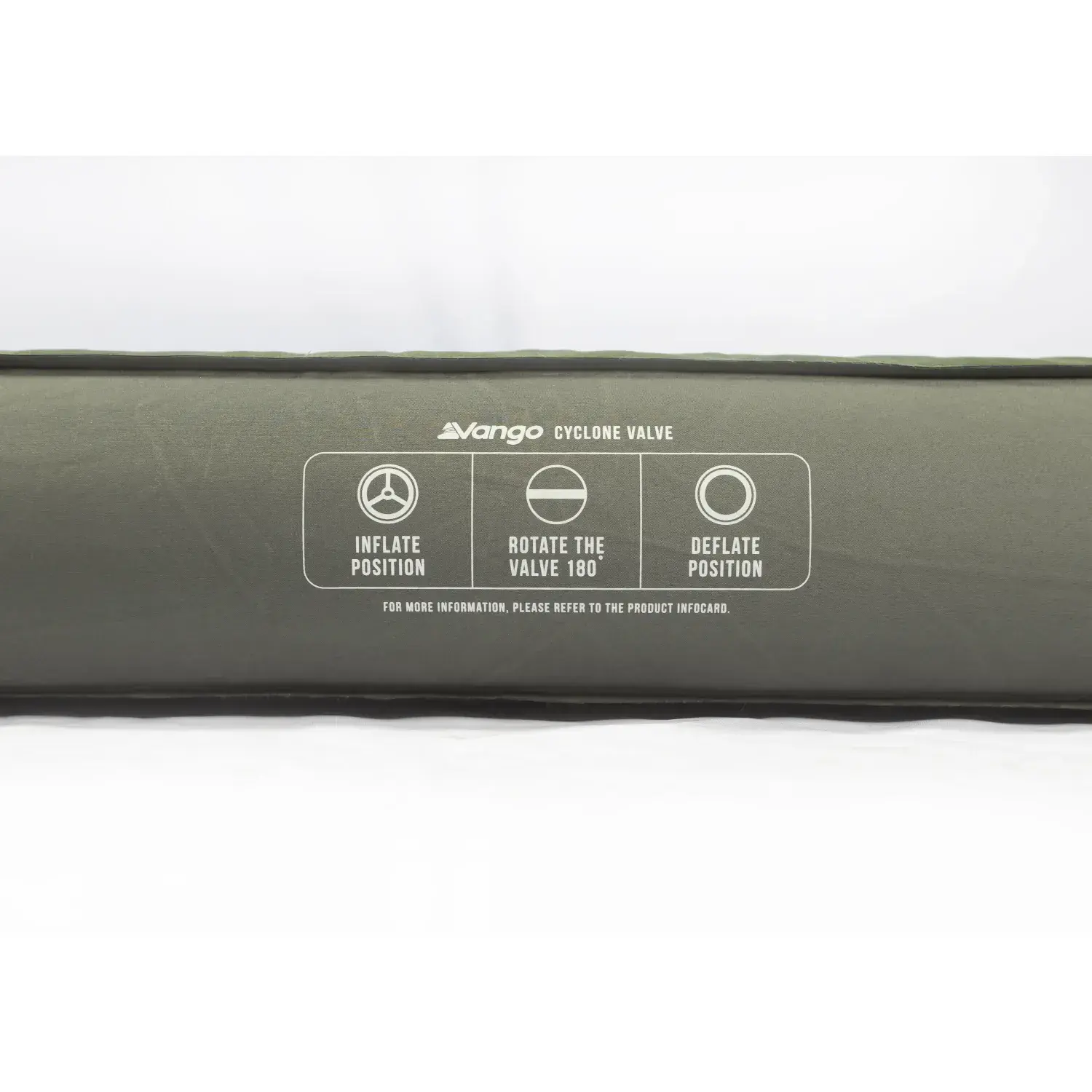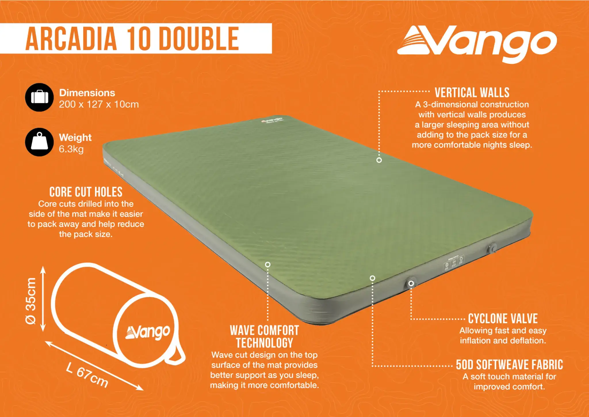 The Vango Arcadia 10cm Double self-inflating sleeping mat offers unrivalled comfort and convenience. Designed with a stylish, soft-touch flocked finish top and durable non-slip base and Cyclone Flip Valve, inflation and deflation are very quick. Simply flip open the valve and watch the mat expand.