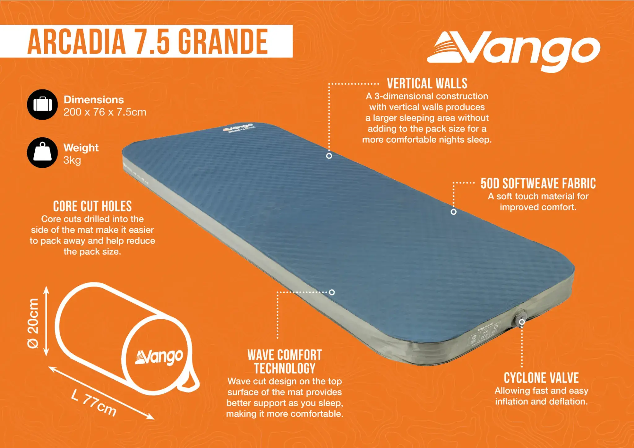 The Vango Arcadia 7.5cm Grande self-inflating sleeping mat offers unrivalled comfort and convenience. Designed with a stylish, soft-touch flocked finish top and durable non-slip base and Cyclone Flip Valve, inflation and deflation are very quick.
