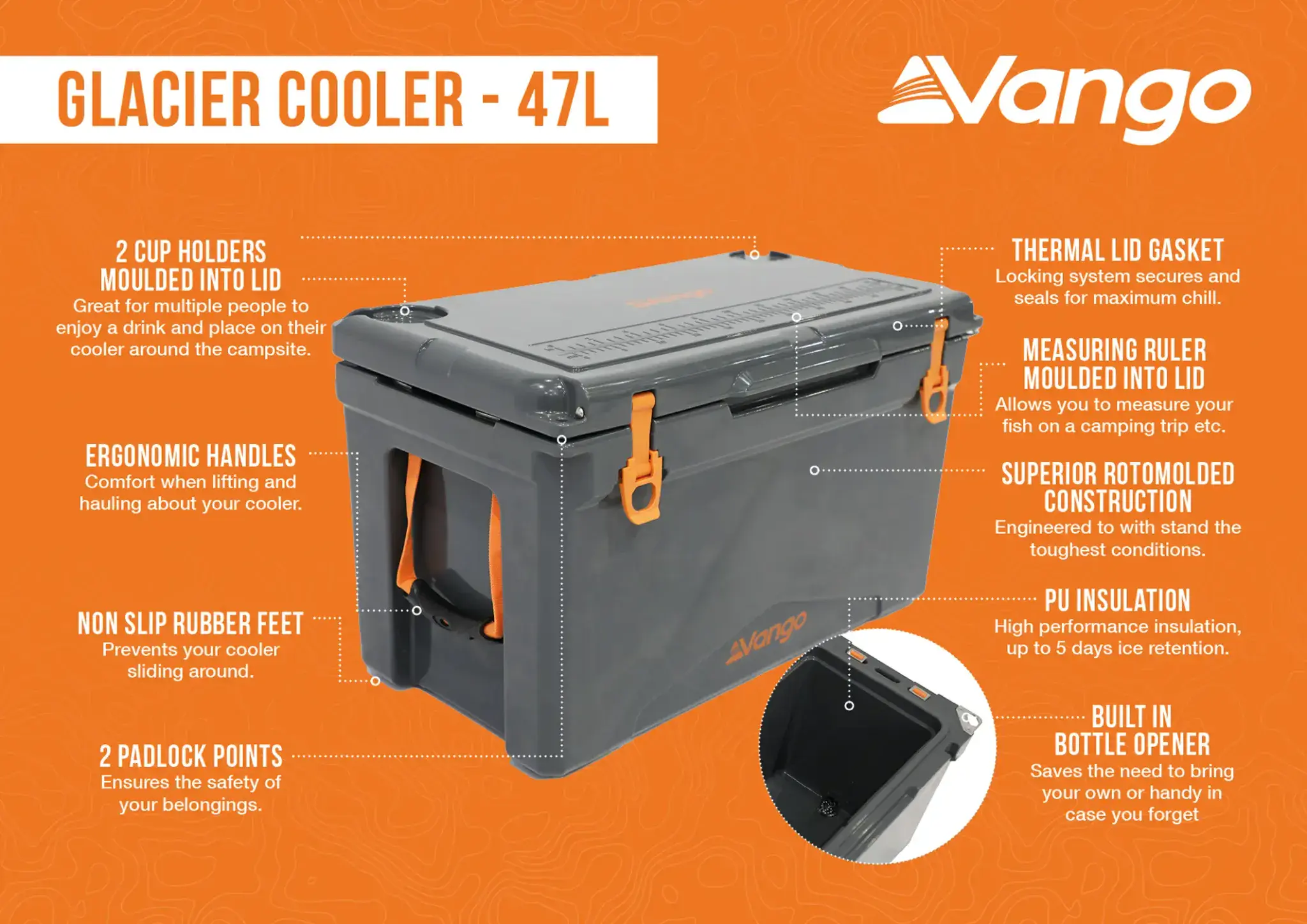 The Vango Glacier 47L Cool Box is a passive camping cooler with a durable rotomolded construction and dense PU insulation for superior performance and to withstand the toughest conditions.