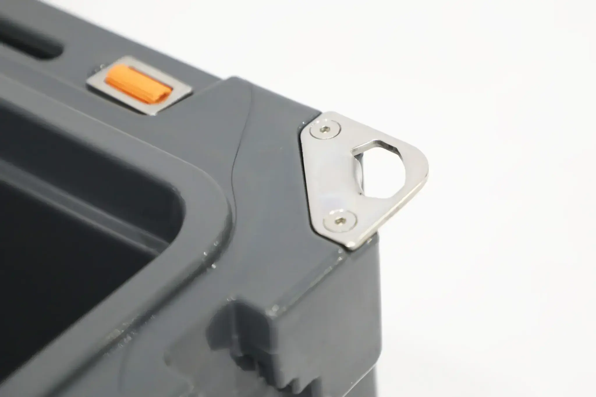 The 47 Litre model is a larger-sized cooler ideal for longer breaks with ergonomic carry handles for easy transportation. Non slip rubber feet prevent the cooler sliding around in your campervan with two drink holders on the lid and a plug in the base for easy drainage. There is the all essential bottle opener on the corner of the corner and both corners also have padlock locking points to keep the drinks secure.