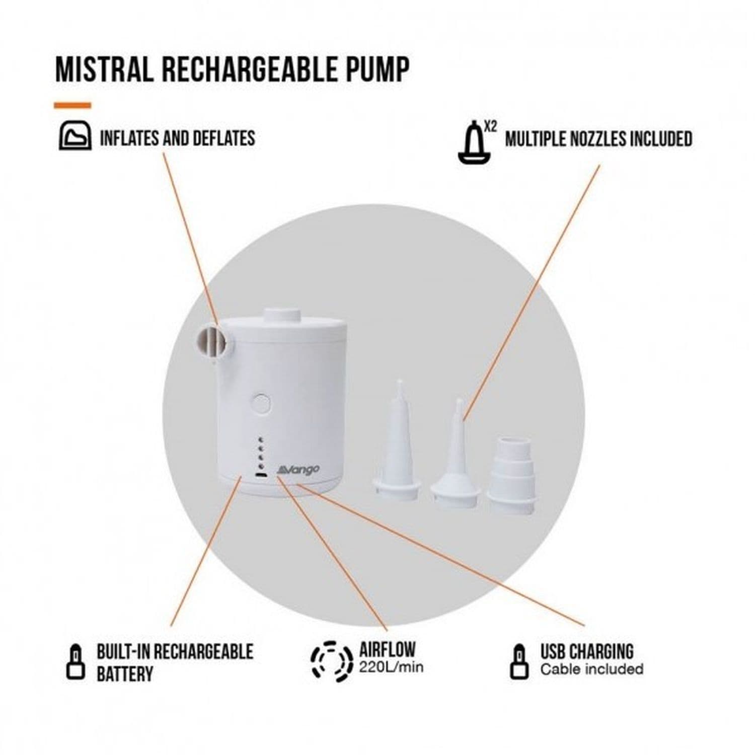 High volume rechargeable electric pump for use with airbeds, air mattresses, inflatable furniture etc. This Vango Airbed Pump is quick to inflate with an airflow of 220L per minute and comes complete with assorted nozzles and USB charging cable. A very portable electric airbed pump for use away from vehicle power and can be charged at home in advance – ideal for festival camping or campsites that don't allow vehicles next to pitches if you like the luxury of an airbed.
