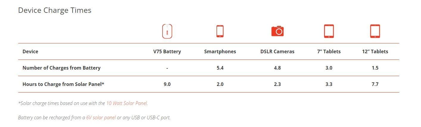 Digital Cameras: Charges both DSLRs and cameras that charge from USB. For DSLRs, an optional camera charger cradle that matches your camera battery is required.