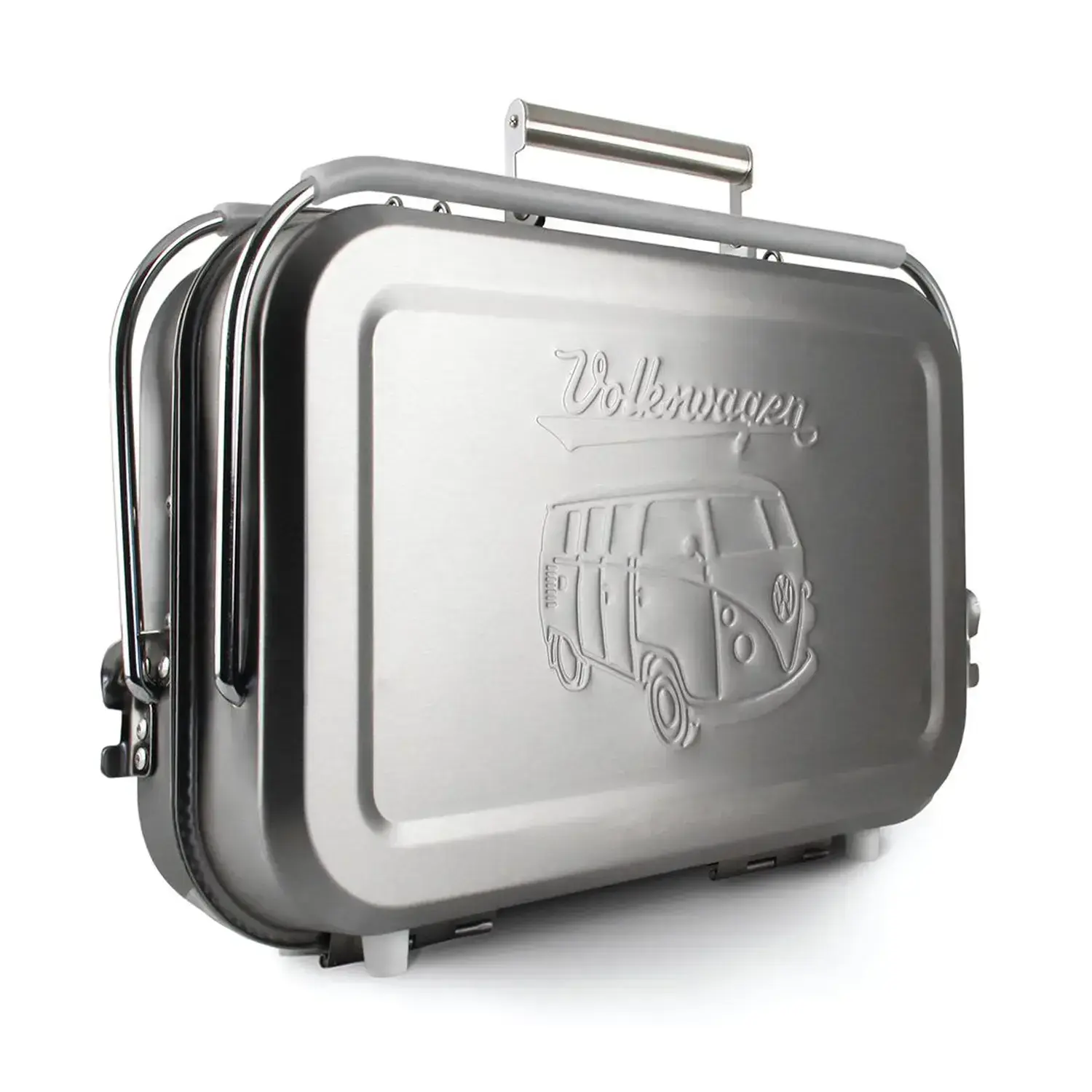 The practical and stylish VW T1 BBQ Grill in a suitcase format is perfect for camping, picnics, or festivals! Its compact size makes it easy to store in your camper or luggage. Are you ready for a spontaneous grilling session, a picnic in the outdoors, or in your own garden? The included stainless steel grill grate and charcoal tray fit inside the folded grill. We have a matching pair of grill gloves in the stylish VW design for you. Design/ Gift Idea/ Other Features: This portable all-rounder is perfect for on-the-go camping trips or visiting friends with a garden. The grilling season becomes a highlight with this stylish BBQ grill! Both sides of the grill feature the silhouette of the VW T1 and the Volkswagen logo. This lightweight mini grill is a durable companion for cool grill parties and a fantastic outdoor accessory that brings the flair of the 60s into your life. The folding grill comes in a sleek white box with a carrying handle, making it a high-quality gift for men and women. A joy for all grill masters and chefs. Material/ Technical Data: The Volkswagen suitcase grill is made of high-quality, rust-free 18/8 stainless steel. Thanks to the rubber-coated fold-out legs, the grill has a secure stand on uneven surfaces. This cool outdoor accessory can be set up in no time and requires no tools for assembly! Its dimensions allow it to fit in any compact car or on a bicycle. As the largest licensee of Volkswagen, we are committed to maintaining the highest quality standards.